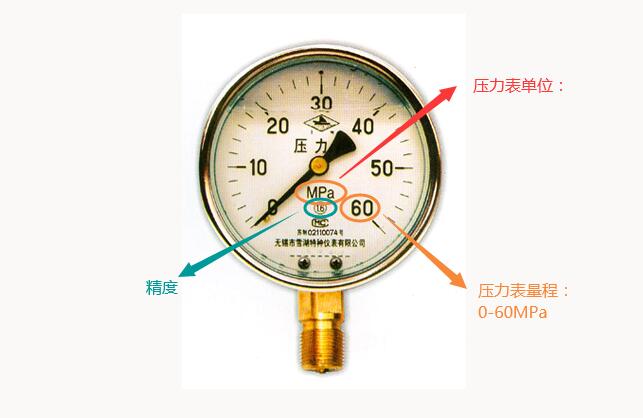 從上圖可以看到,該壓力表的單位是MPa,最大量程是60MPa,最小量程是0MPa,所以全量程是0~60MPa。壓力表的刻度是均等標識的,由此可以看出壓力表由10、20、30、40、50、60均分,便于讀取,而等分數字之間每一個刻度就是2MPa。
